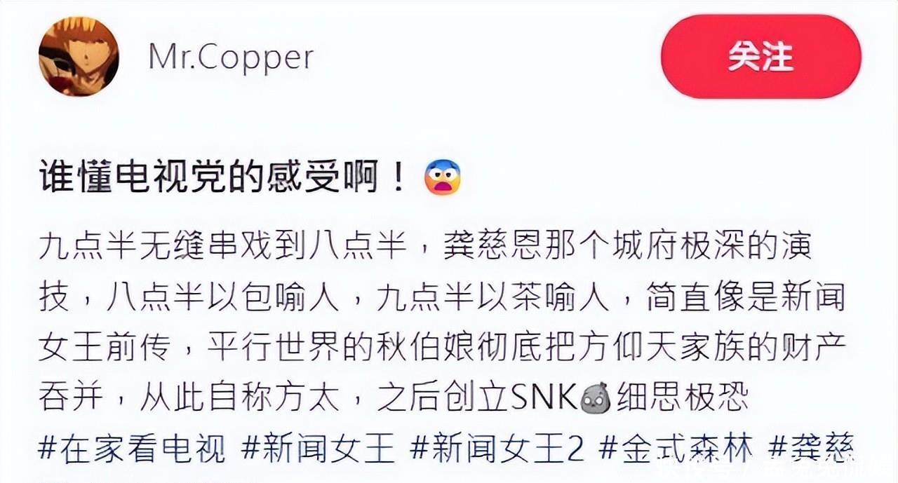 有观众指出龚慈恩在角色黑化前后的反差极大却没有丝毫突兀展现出极强的戏剧掌控力《新闻女王2》再演“大BOSS” 龚慈恩双剧齐开强势吸睛与此同时另一部新剧《新闻女王2》也同步开播龚慈恩在剧中饰演大权在握的“方太”依旧气场全开角色具压迫感与神秘感兼具。有观众笑言一晚看两套剧她都刚好演名为“方太”的狠角色令追剧过程趣味十足。